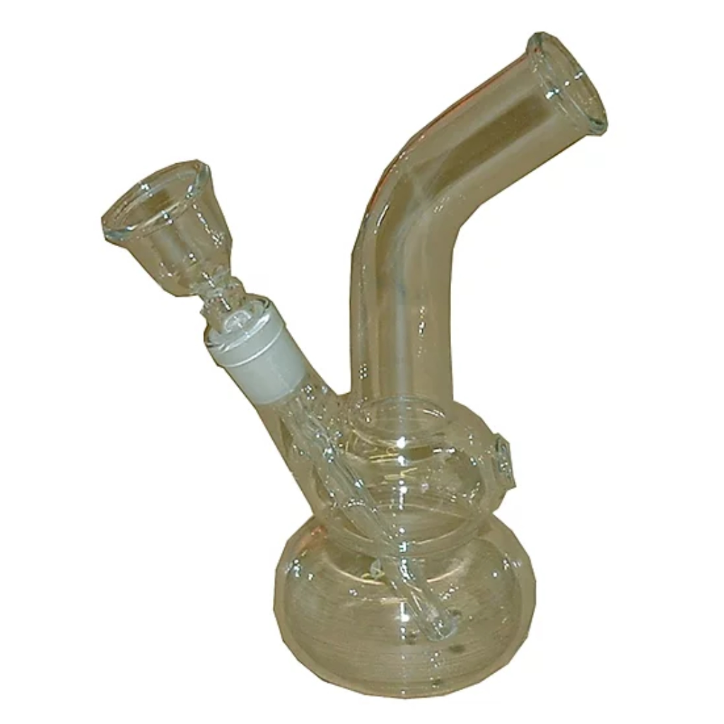 An all glass mini bong from Basil Bush . Double bubble, glass stem and lean back.