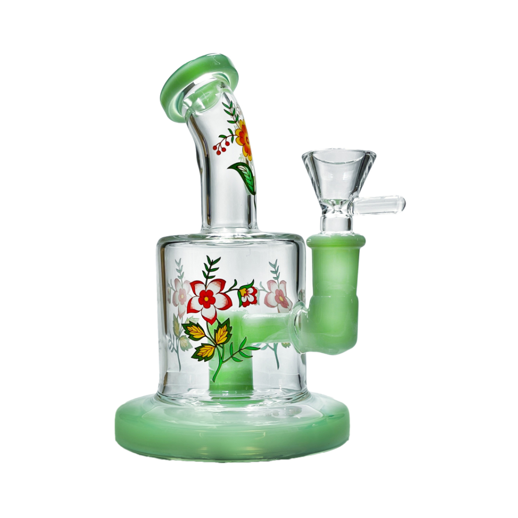 A pretty 15 cm tall glass bong with floral design, an inline stem , percolator, 14mm removable glass bowl and sturdy base.