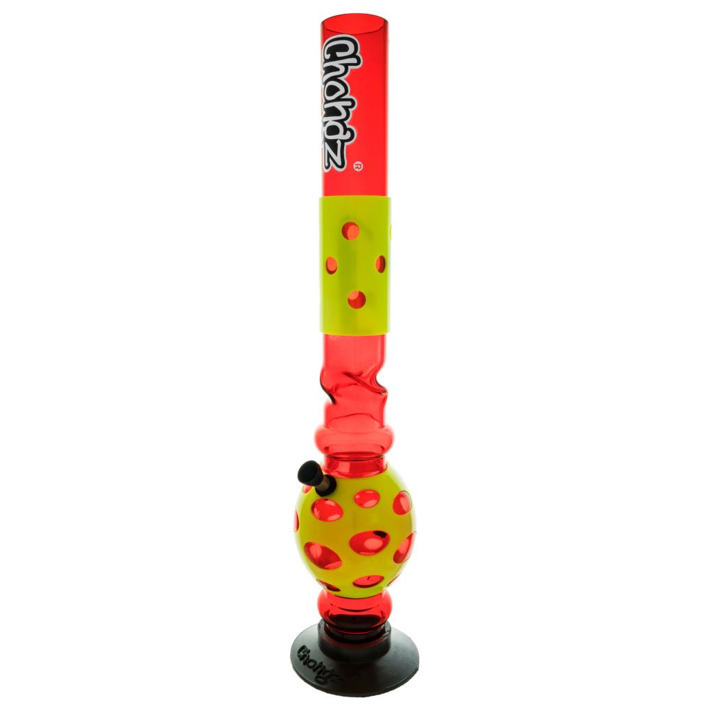 A 50cm tall acrylic bong from Chongz. A large water capacity ensures a cool smoke and decorative acrylic wraps on the neck and the bubble add extra protection from knocks.