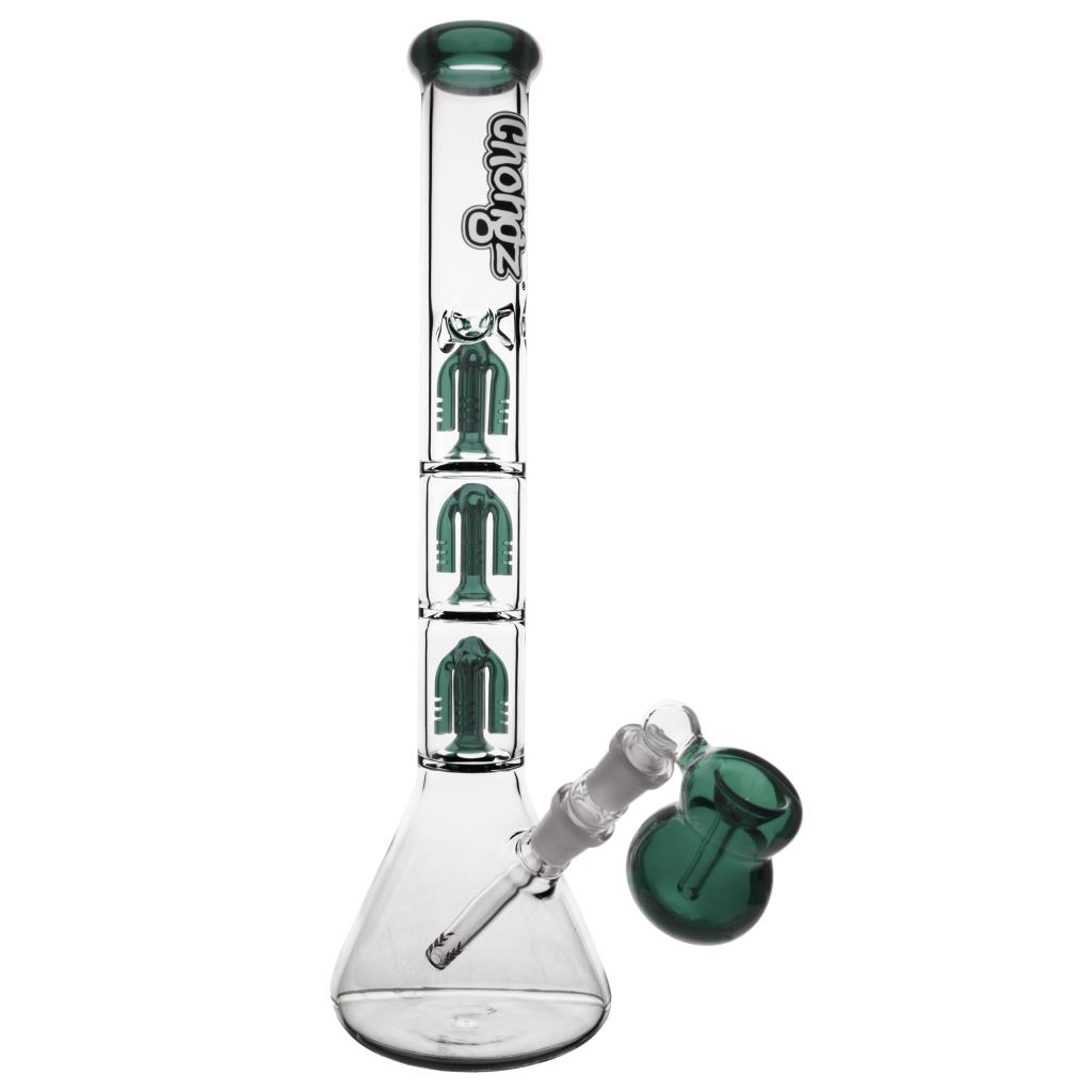 Another great one from Chongz! It’s got the lot! Conical base for stability, removable diffuser stem with a removable ash catcher that can be replaced with a normal bowl if you wish. Three Tree arm percs to help with cooling the smoke as well as ice pins.