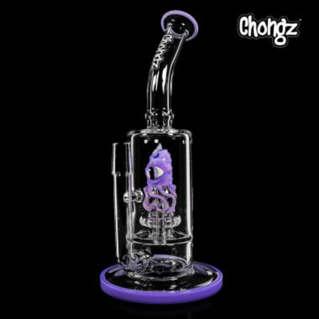 This 30 cm 2 in 1 bong from Chongz can be used as a bong or a dab rig as it comes complete with paddle lift bowl, dome and nail. A round heavy base keeps this piece stable and the lean back mouthpiece makes it comfortable to use. The built in perc resembles some sort of one eyed monster from the deep making this a beautiful attractive collectors item.