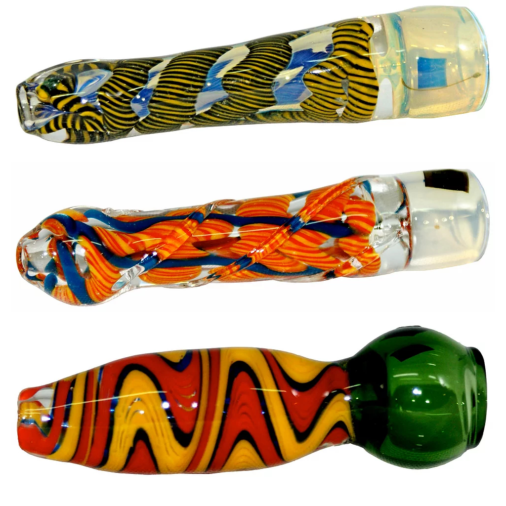 Coloured glass chillums approx 3″ long in various shapes, colours and patterns
