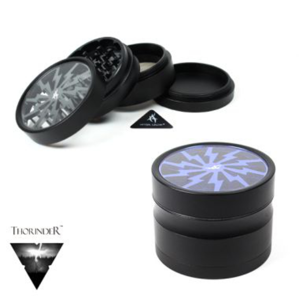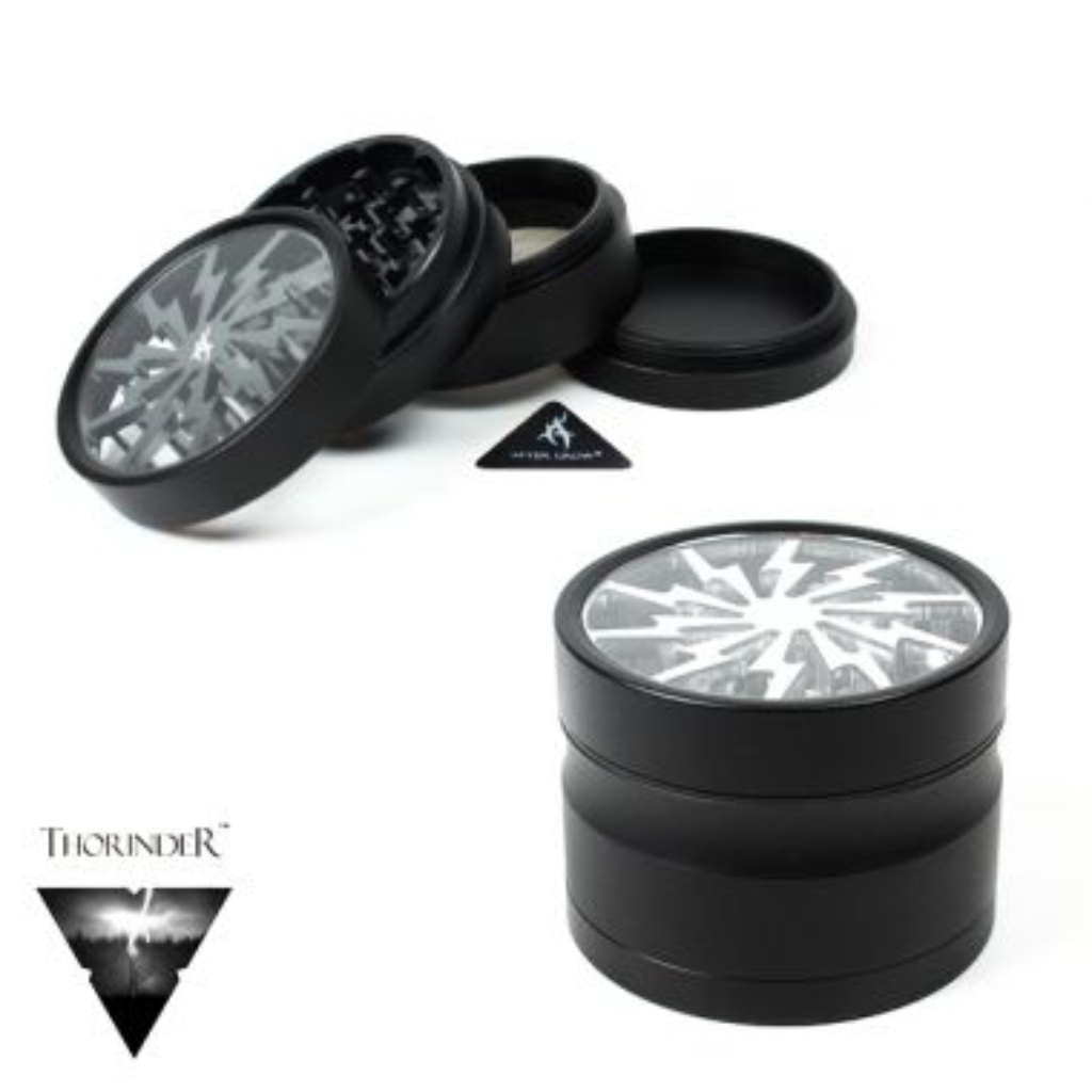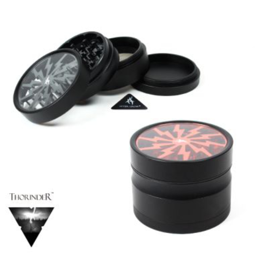 The Thorinder is a quality Grinder by After Grow, made from Aircraft Grade Aluminium and Stainless Steel. With an ergonomic grip and a clear top. The unique lightning bolt design which makes the difference as most clear top grinders have plastic teeth, this has metal teeth machined into the lightning bolts. The Thorinder 62mm grinder is available in 5 colors; silver, orange, green, blue and a special edition red with green.